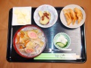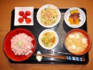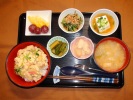 ちらし寿司(煮あげ、煮しいたけ、人参、かんぴょう、でんぶ、きんし玉子、いんげん)、すまし汁(椎茸、玉ふ、三つ葉)、とり立田揚げ(サニーレタス、マヨネーズ)、かぶとカニカマのあんかけ(かぶ葉)、ごぼうサラダ、フルーツ:イチゴ、リンゴ |