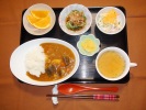 茄子ポークカレー(豚肉、人参、ジャガイモ、玉ネギ、揚げ茄子)、コンソメオニオンスープ(パセコン)、マカロニサラダ(人参、キュウリ、ロースハム、ゆでたまご)、大根おかかたくあん、水菜おひたし(おかかがけ)、フルーツ:バレンシアオレンジ |