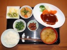 ごはん、味噌汁(ワカメ、おふ、長ネギ)、デミグラスハンバーグ(ブロッコリー、カリフラワー、人参)、田舎煮(大根、人参、あげ、竹輪、さつま揚げ、いんげん)、ほうれん草のなめ茸和え、うづら豆煮、フルーツ:リンゴ、キュウイフルーツ |