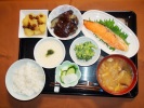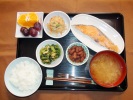 麦ごはん(3割)、味噌汁(白菜、椎茸、あげ)、チリ産の鮭塩焼き(大葉)、茄子胡麻味噌田楽、ブロッコリードレッシング和え、とろろ芋(青のり)、蕪とキュウリの梅しそ漬け、フルーツ:リンゴコンポ―ト(レーズン入り) |