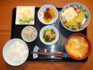 親子丼(とり肉、玉ネギ、なると、たまご、三つ葉)、味噌汁(白菜、あげ)、水菜おひたし(おかか)、煮やっこ(万能ネギ)、白花いんげん豆煮、キュウリ中華炒め、フルーツ:生パイナップル、ぶどう(レッドグローブ) |