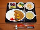 茄子ポークカレー(豚肉、じゃがいも、玉ネギ、人参、揚げ茄子、福神漬け)、コンソメオニオンスープ(パセコン)、コールスローサラダ(キャベツ、人参、キュウリ)、ゆで玉子のあんかけ(ブロッコリー)、フルーツ:キュウイフルーツ、ぶどう(レッドグローブ) |