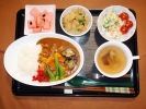 夏野菜カレー(豚肉、玉ネギ、人参、じゃがいも、かぼちゃ、アスパラ、揚げ茄子、福神漬け)、いろいろキノコのコンソメスープ、コールスローサラダ(キャベツ、人参、キュウリ、ミニトマト)、大根とシーチキン煮(大根葉)、フルーツ:大玉スイカ |