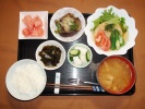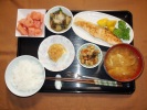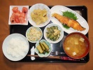 ごはん、味噌汁(白菜、しいたけ、あげ)、チリ産の塩シャケ焼き(大根おろし、甘酢しょうが)、ブロッコリーサラダ、昆布佃煮(千切り生姜)、キュウリとキャベツの漬物、フルーツ:大玉スイカ |