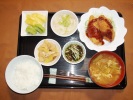 ごはん、味噌汁(玉ネギ、たまご、かぶ葉)、チキンカツ(特製ソース、千切りキャベツ)、蕪とカニカマのあんかけ(かぶ葉)、真竹煮(あげ)、もずく酢(キュウリ)、フルーツ:生パイナップル、キュウイフルーツ |