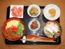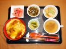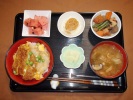 親子丼(とり肉、玉ネギ、なると、玉子、三つ葉)、味噌汁(大根、あげ、かぶ葉)、茄子炒め煮(すり胡麻)、水菜おひたし(おかか)、豆腐なめたけがけ、フルーツ:大玉スイカ |