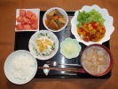 ごはん、味噌汁(豆腐、あげ、長ネギ)、チリ産の鮭の塩焼き(大葉)、真竹の煮物(あげ)、卯の花(人参、椎茸、あげ、竹輪、さつま揚げ、長ネギ、枝豆、たまご)、ゴーヤ炒め(豚肉、たまご)、キュウリ中華炒め、フルーツ:大玉スイカ |