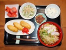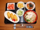 いなり寿司(紅生姜)、そうめん汁(椎茸、紅かまぼこ、みょうが、万能ネギ)、ジャガイモの粉ふき煮、ブロッコリー胡麻ドレ和え、トマトわさび醤油和え(白胡麻、細海苔)、フルーツ:大玉スイカ |