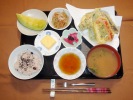 お赤飯(胡麻塩)、味噌汁(豆腐、なめこ、三つ葉)、天ぷら盛合せ(天つゆ、茄子、パプリカ黄・赤、オクラ、竹輪いそべ)、金平ごぼう(白すり胡麻)、厚焼き玉子、生姜しそ漬け、フルーツ:メロン |