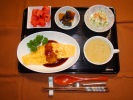 チキンオムライス(デミグラスソース、パセリ)、コンソメオニオンスープ(パセコン)、コールスローサラダ(キャベツ、人参、キュウリ)、かぼちゃいとこ煮、フルーツ:大玉スイカ |