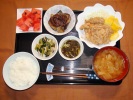 ごはん、味噌汁(白菜、椎茸、あげ)、豚肉生姜焼き(うす切り豚ロース、千切りキャベツ、ズッキーニ)、茄子の胡麻味噌田楽、小松菜炒め(あげ、おかか)、もずく酢(キュウリ、三杯酢)、フルーツ:大玉スイカ |