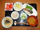 ごはん、味噌汁(白菜、あげ)、さば塩焼き(大葉、大根おろし)、キャベツ・人参のおひたし(おかか)、新ジャガイモの粉ふき煮、ひじきと大豆煮、フルーツ:大玉スイカ |