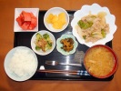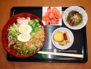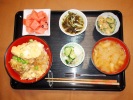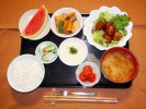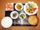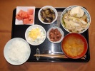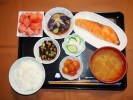 ごはん、味噌汁(とうがん、しいたけ)、鮭の塩焼き(チリ産)、揚げ茄子びたし(みょうが)、ひじき煮(大豆、あげ、人参、グリーンピース)、ミニトマトのマリネ、大根・キュウリ・みょうがの梅しそ漬け、フルーツ:スイカ |