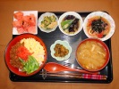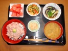 まぐろ丼(刻み海苔、キュウリわさび乗せ)、味噌汁(茄子、あげ、みょうが)、茄子揚げびたし(オクラ)、ゴーヤ炒め(豚肉、パプリカ、たまご)、白花いんげん豆、フルーツ:スイカ |