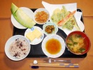 お赤飯(ごま塩)、味噌汁(豆腐、なめこ、三つ葉)、天ぷら盛合せ(さつま芋、かぼちゃ、いんげん、茄子、ピーマン、パプリカ赤、アスパラ、竹輪いそべ)、金平ごぼう、厚焼きたまご、キュウリパリパリ漬け、フルーツ:メロン |