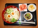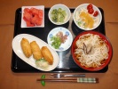 冷しうどん(細うどん、キュウリ、カニカマ、あげ玉、煮しいたけ、煮あげ、オクラ、みょうが、万能ネギ、ゆで玉子)、さつま芋レモン煮、茄子とピーマンの炒め煮(白すり胡麻)、フルーツ:スイカ |