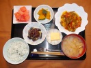 ごはん、味噌汁(キャベツ、なめこ、あげ)、豆腐魚すり身ハンバーグ(茄子、ズッキーニ―、オクラ、ミニトマト、なめ茸あんかけ)、かぼちゃ煮、長芋の千切りポンズ醤油(刻み海苔)、キュウリ中華炒め、フルーツ:スイカ |