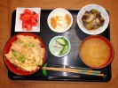 かつ丼(豚ロースかつ、玉ネギ、たまご、グリーンピース)、味噌汁(白菜、しいたけ)、茄子とピーマン炒め煮(白胡麻)、冷奴のなめ茸がけ、キュウリと大根のうめしそ漬け、フルーツ:スイカ |