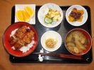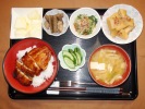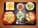 かつ丼(豚ロースかつ、玉ネギ、たまご、グリンピース)、味噌汁(白菜、なめこ)、かぼちゃいとこ煮、水菜のおひたし(おかか)、キュウリ漬物、フルーツ:リンゴ |