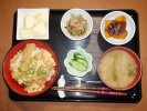 かつ丼(豚ロースカツ、玉ネギ、たまご、グリンピース)、味噌汁(ワカメ、おふ、長ネギ)、かき菜の辛子マヨネーズ和え、うずら豆煮、キュウリの一夜漬け、フルーツ:ミネオラオレンジ |