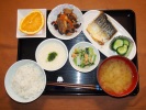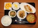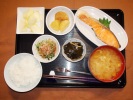 ごはん、味噌汁(玉ネギ、たまご)、チリ産塩鮭焼き(大葉添え)、ジャガイモの粉ふき煮、昆布煮(針生姜)、水菜おひたし(おかか)、フルーツ:リンゴ |