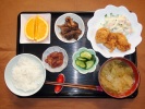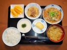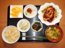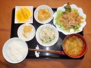 ごはん、味噌汁(白菜、椎茸)、豚肉生姜焼き(玉ネギ、サニーレタス、マヨネーズ)、ジャガイモのこふき煮、酢の物(もやし、キュウリ、竹輪、白すり胡麻)、豆腐なめ茸がけ、フルーツ:カシュ―オレンジ |