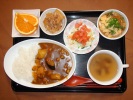 茄子ポークカレー(豚肉、玉ネギ、人参、ジャガイモ、揚げ茄子、福神漬け)、いろいろキノコのコンソメスープ、コールスローサラダ(キャベツ、人参、キュウリ、トマト)、仙台ふの玉子とじ(万ネギ)、竹の子の土佐煮(おかか)、フルーツ:清美タンゴールド |