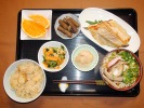 ごはん、味噌汁(白菜、椎茸、あげ)、ホッケ塩焼き、マカロニポテトサラダ(人参、キュウリ、ロースハム、ゆでたまご)、竹の子の土佐煮とふき煮、水菜おひたし(おかか)、フルーツ:ミネオラオレンジ |
