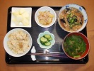 麦ごはん(3割)、味噌汁(キャベツ、椎茸、あげ、万能ネギ)、豆腐のひき肉あんかけ(万能ネギ)、竹の子の土佐煮、とろろ芋(青のり)、厚焼きたまご、フルーツ:ミネオラオレンジ |