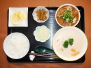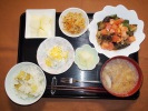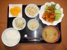 ごはん、味噌汁(白菜、なめこ)、揚げシューマイの甘酢あんかけ(サニーレタス、ピーマン、パプリカ赤・黄)、うの花(人参、椎茸、あげ、竹輪、さつま揚げ、長ネギ、むき枝豆、たまご)、酢の物(もやし、キュウリ、竹輪)、白花のいんげん豆煮、フルーツ:デコポン |