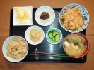 竹の子ごはん(とり肉、あげ)、味噌汁(豆腐、あげ、ワカメ、長ネギ)、かき干しエビと玉ねぎの揚げくずあんかけ、うの花(人参、竹輪、椎茸、さつま揚げ、枝豆、長ネギ、たまご)、大根の胡麻味噌田楽、キュウリの一夜漬け、フルーツ:はるか |