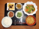 ごはん、味噌汁(大根、あげ、椎茸)、豚肉と茄子の味噌炒め(人参、ピーマン、竹の子、絹さや)、かき菜の辛子マヨネーズ和え、ふき煮、うずら豆煮、フルーツ:リンゴコンポート(レーズン) |