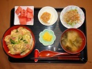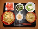 親子丼(とりもも肉、玉ネギ、なると、たまご、三つ葉)、味噌汁(おふ、ワカメ、長ネギ)、おひたし(キャベツ、人参、三つ葉、おかか)、豆腐なめ茸がけ、大根の一本漬け、フルーツ:大玉スイカ |