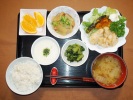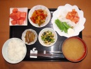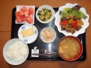 ごはん、味噌汁(大根、なめこ)、揚げシューマイの甘酢あんかけ(ピーマン、パプリカ赤・黄)、ふき煮、小松菜炒め(あげ、おかか)、新玉ネギとトマトのサラダ・スナップエンドウ添え(マヨネーズ、ポン酢)、フルーツ:大玉スイカ |