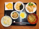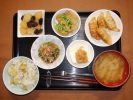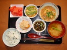 さつま芋ごはん、味噌汁(白菜、椎茸)、揚げギョーザ、豚肉と大根炒め煮(大根葉)、水菜おひたし(おかか)、豆腐なめ茸がけ、フルーツ:リンゴコンポート(大粒レーズン) |