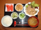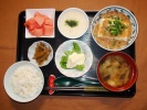 ごはん、味噌汁(茄子、あげ)、豚肉しょうが焼き(サニーレタス、マヨネーズ)、竹の子土佐煮(おかか)、ブロッコリー胡麻ドレ和え、キュウリ漬物、フルーツ:大玉スイカ |