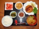 ごはん、味噌汁(大根、なめこ、大根葉)、メンチカツ(千切りキャベツ、パセリ、特製ソース、竹の子土佐煮(おかか)、うずら豆煮、キュウリ中華炒め、フルーツ:大玉スイカ |