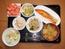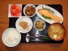 ごはん、味噌汁(豆腐、あげ、椎茸、長ネギ)、チリ産の塩鮭焼き(大葉添え)、いもがら煮(人参、あげ、こんやく、竹輪、さつま揚げ)、小松菜とあげの炒め物(おかか)、新玉ネギのサラダ(おかか)、フルーツ:大玉スイカ |
