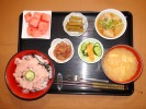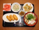 いなり寿司、そうめん汁(椎茸、万能ネギ、紅かまぼこ)、かき揚げ(玉ネギ、小エビ、刻み昆布)、酢の物(もやし、キュウリ、竹輪、白すり胡麻)、ふき煮、フルーツ:大玉スイカ |