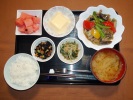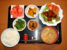 ごはん、味噌汁(大根、椎茸、あげ)、ミートボール中華甘酢あんがけ(サニーレタス、トマト、マヨネーズ)、かぼちゃ煮、菜の花の辛子和え、大豆五目煮、フルーツ:大玉スイカ |