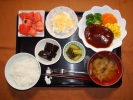 ごはん、味噌汁(茄子、みょうが)、デミグラスハンバーグ(ブロッコリー、ニンジン、コーン)、マカロニポテトサラダ(人参、キュウリロースハム、ゆで玉子)、にしん昆布巻き、キュウリ中華炒め、フルーツ:大玉スイカ |