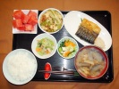 ごはん、味噌汁(茄子、あげ、みょうが)、ノルウエー産サバの塩焼き(大葉、大根おろし)、仙台ふと絹さやのたまごとじ、小松菜の胡麻和え(人参、紅かまぼこ)、キャベツ・キュウリ・人参の一夜漬け、フルーツ:大玉スイカ |