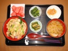 親子丼(とりもも肉、玉ネギ、なると、たまご、三つ葉)、味噌汁(白菜、椎茸)、菜の花の辛子和え、豆腐なめ茸がけ、キュウリ中華炒め、フルーツ:大玉スイカ |