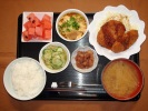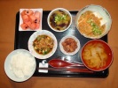 ごはん、味噌汁(大根、なめこ)、とんかつ(豚ロース、千切りキャベツ、特製ソース)、茄子の炒め煮(白すり胡麻)、菜の花の辛子和え、うずら豆煮、フルーツ:大玉スイカ |