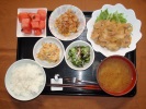 ごはん、味噌汁(白菜、椎茸)、豚肉生姜焼き(豚ロース、玉ネギ、水菜)、真竹の土佐煮、うの花(人参、椎茸、あげ、竹輪、さつま揚げ、枝豆、長ネギ、たまご)、酢の物(キュウリ、ワカメ、カニカマ)、フルーツ:大玉スイカ |