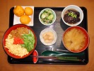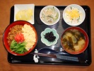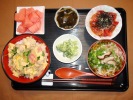 まぐろすきみ丼(刻み海苔、キュウリわさび乗せ)、味噌汁(白菜、椎茸、松山あげ)、田舎煮(大根、人参、椎茸、竹輪、さつま揚げ、あげ、いんげん)、小松菜の胡麻和え(人参、紅かまぼこ)、もずく酢(キュウリ)、フルーツ:ゴールデンキュウイ、グリーンキュウイ |