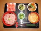 まぐろすきみ丼(刻み海苔、キュウリわさび乗せ)、味噌汁(玉ネギ、たまご)、田舎煮(大根、人参、こんやく、さつま揚げ、椎茸、いんげん)、小松菜炒め(あげ)、キュウリ一夜漬け、フルーツ:大玉スイカ |