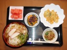 そうめん汁(紅かまぼこ、万能ネギ、みょうが)、かき揚げ(玉ネギ、小エビ、刻み昆布)、かぼちゃいとこ煮、水菜のおひたし(おかか)、フルーツ:大玉スイカ |