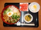 冷し細うどん(キュウリ、煮あげ、煮椎茸、カニカマ、揚玉、万能ネギ、みょうが、ゆでたまご)、ポテトサラダ(人参、キュウリ、ロースハム、ゆでたまご)、キュウリ中華炒め、フルーツ:大玉スイカ |