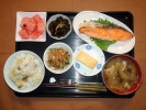 さつま芋ごはん、味噌汁(茄子、あげ、みょうが)、鮭の塩焼き(大葉)、水菜おひたし(おかか)、昆布煮(新生姜)、厚焼きたまご、フルーツ:大玉スイカ |